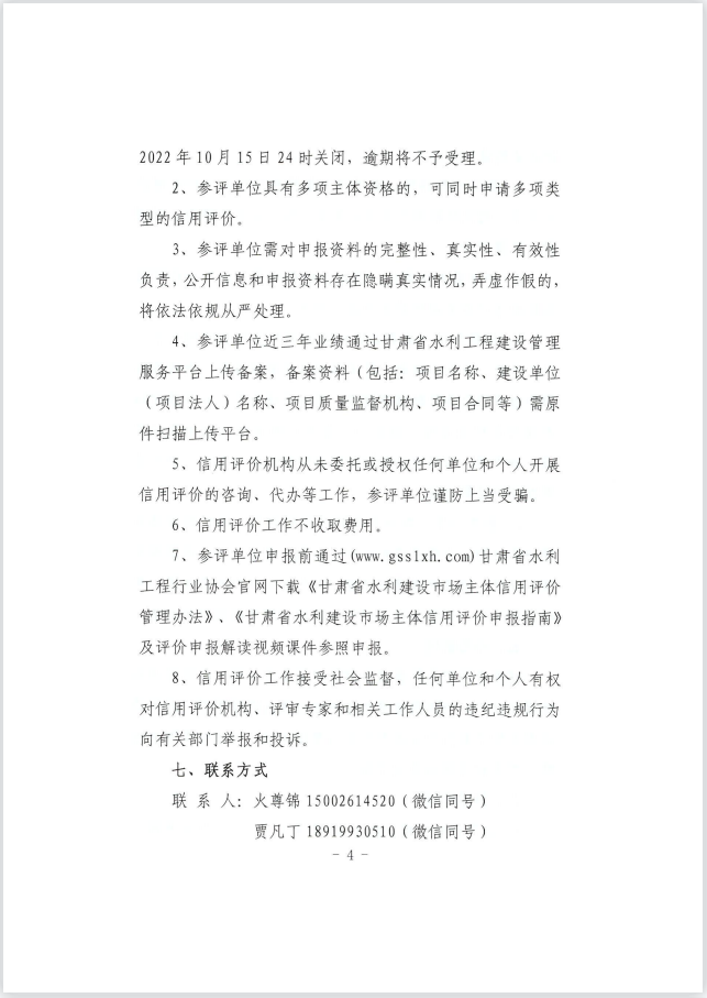 【信用評(píng)價(jià)】甘肅省水利工程行業(yè)協(xié)會(huì)關(guān)于開展全省水利建設(shè)市場(chǎng)主體信用評(píng)價(jià)工作的通知特別提示:信用評(píng)價(jià)申報(bào)系統(tǒng)自2022年9月15日0時(shí)正式啟動(dòng)至2022年10月15日24時(shí)關(guān)閉,為了便于協(xié)會(huì)與參評(píng)單位溝通銜接,協(xié)會(huì)建立六類(施工、監(jiān)理、設(shè)計(jì)、檢測(cè)、招標(biāo)代理、制造供貨)微信群,請(qǐng)各參評(píng)單位按照各自的類別聯(lián)系協(xié)會(huì)工作人員入群。